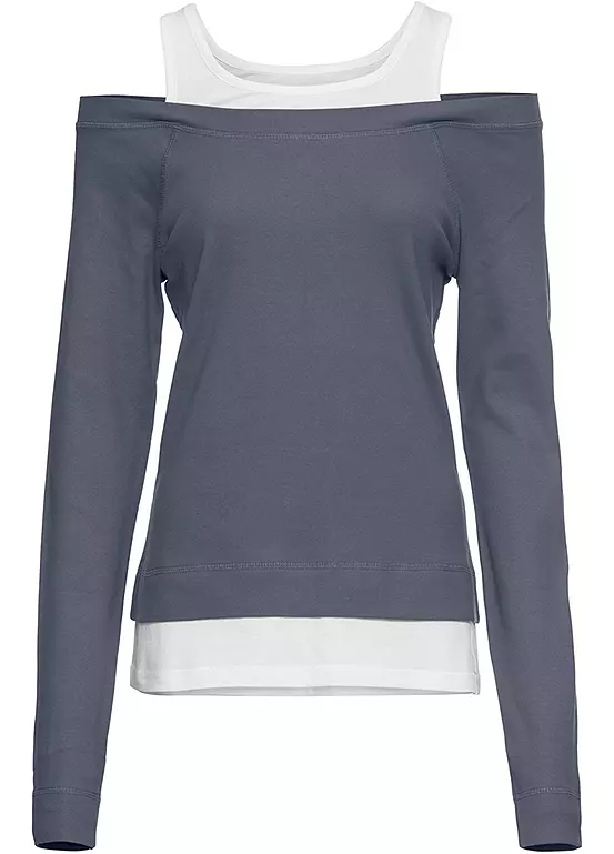 Stylish long sleeve jersey top with a generous boat neck that reveals a vest beneath it.
