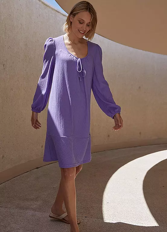 Long sleeve dress with ties at the roundneck and an A-line shape. 98% Polyester, 2% Elastane. Length approx. 94 cm.