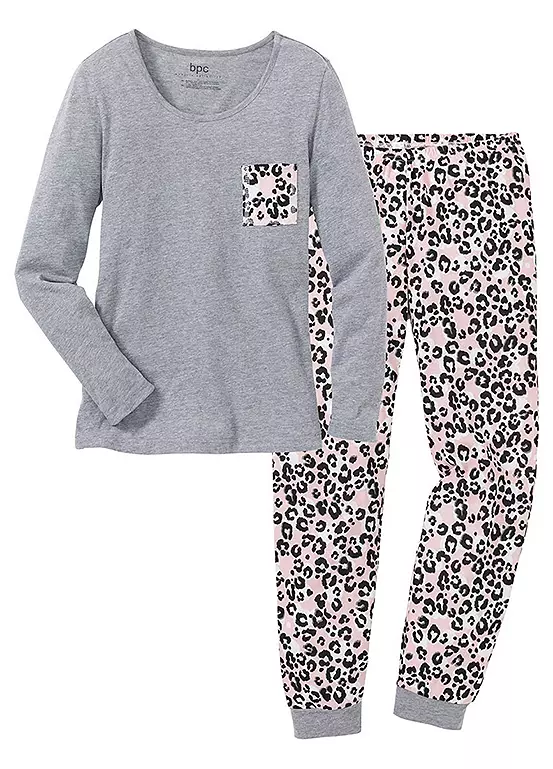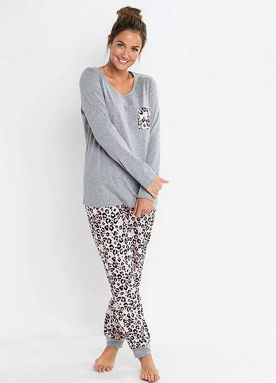 A long sleeve PJ top with an animal print pocket and matching bottoms. Machine washable. 80% Cotton, 20% Polyester, Bottoms: 100% Cotton.
