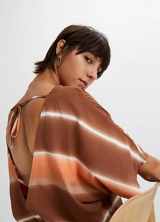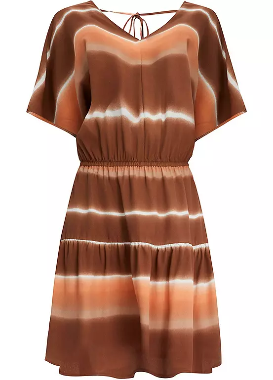 Batik stripe print dress with fluted sleeves and a tie at the back. Machine washable. 100% Polyester. Length approx. 94 cm.