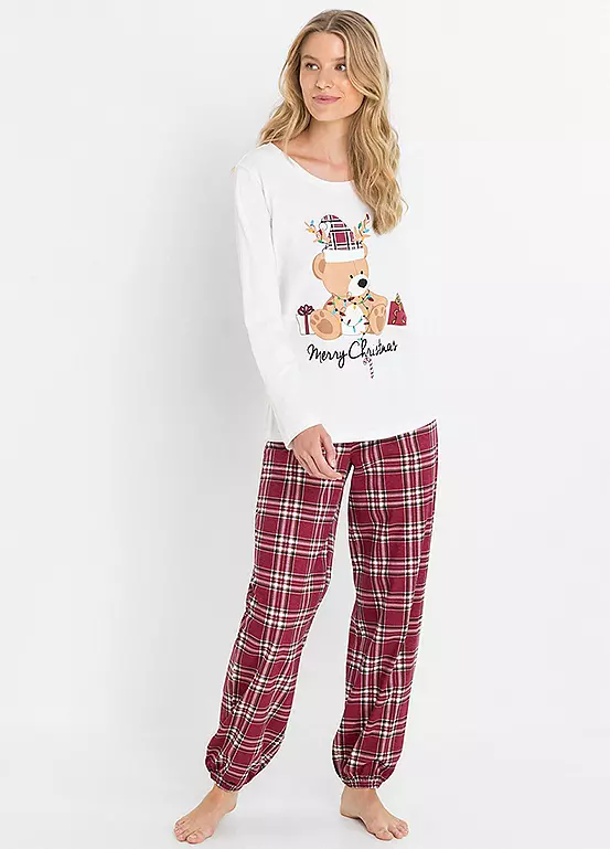 Cute Christmas teddy motif print pyjama top with ’Merry Christmas’ slogan and check pyjama bottoms. Machine washable at 40°C. Bottoms: 100% Cotton (Organic). Top: 100% Cotton (Organic).