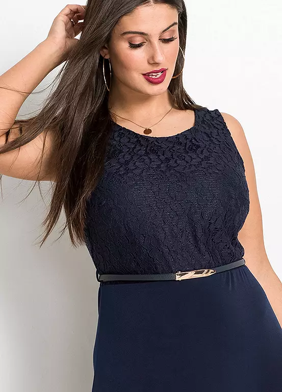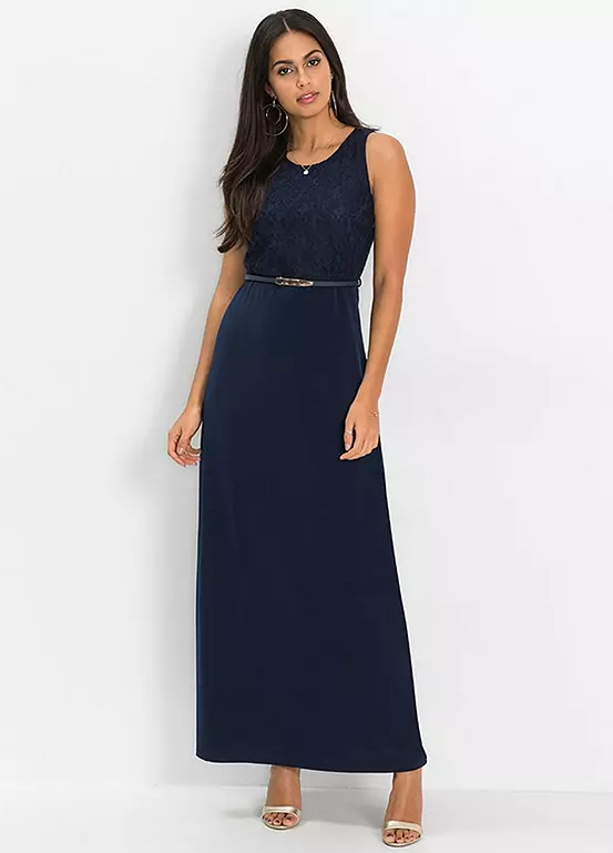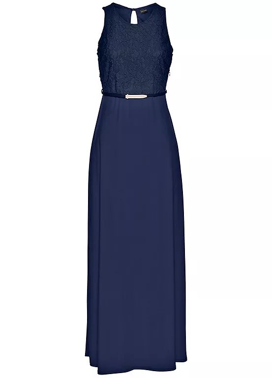With a floral lace bodice and a slim waist belt, this ankle length dress is red carpet ready and waiting! Machine washable. Shell: 95% Polyester, 5% Elastane, Lace: 65% Cotton, 35% Polyester, Lining: 100% Polyester. Length approx. 148 cm.