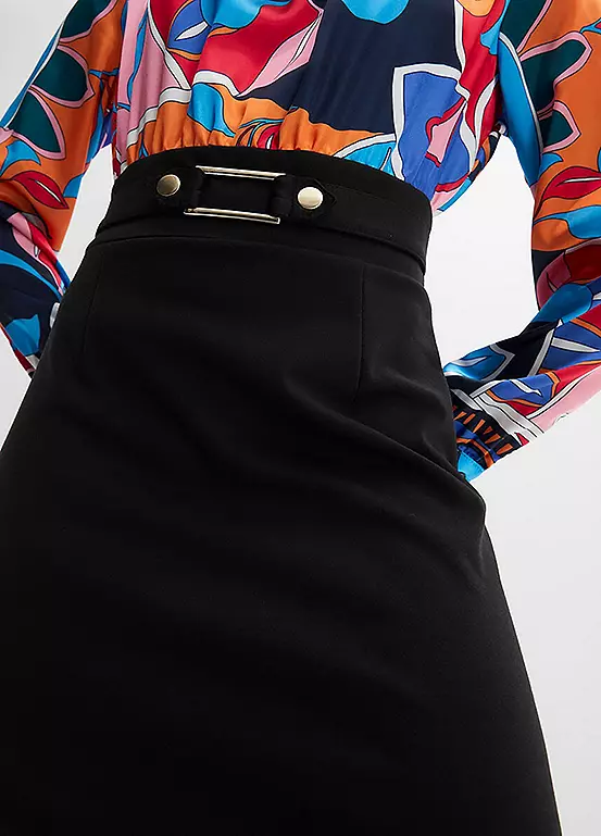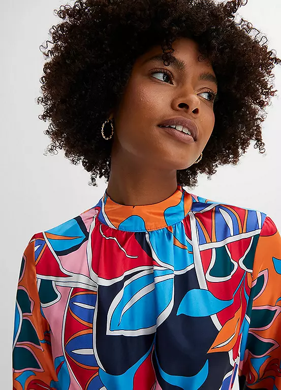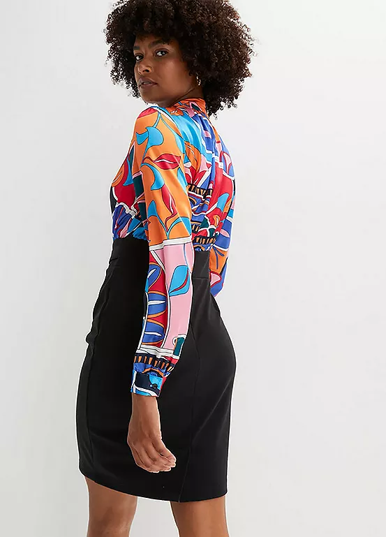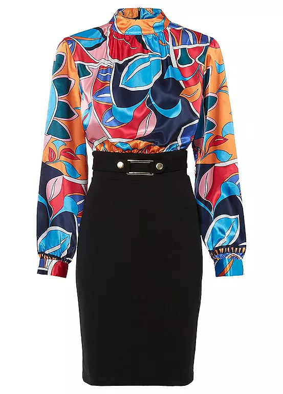 Two tone dress with a printed blouse bodice and a pencil skirt. Machine wash. Length approx. 114 cm.