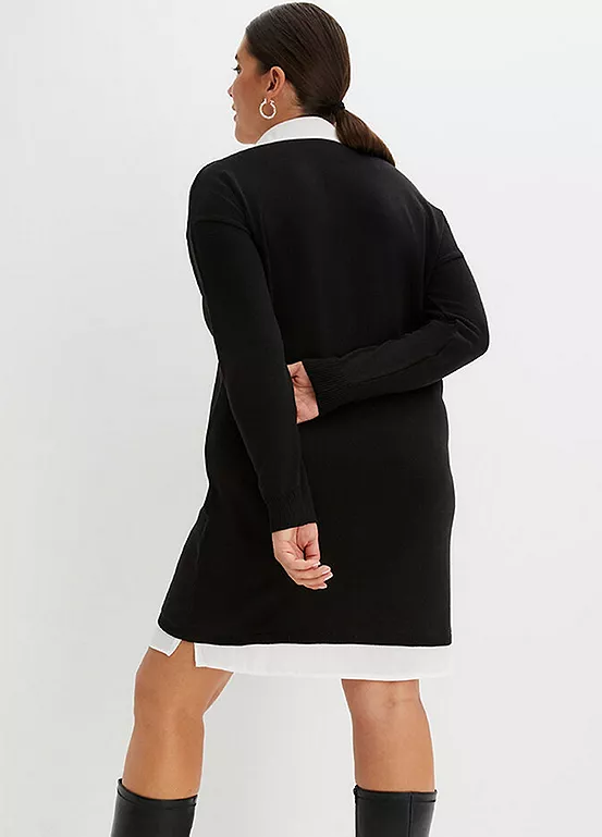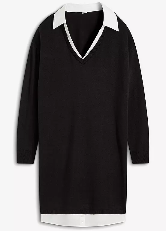 Short knitted dress with a white blouse collar, cuffs and hem. Length approx. 94 cm.