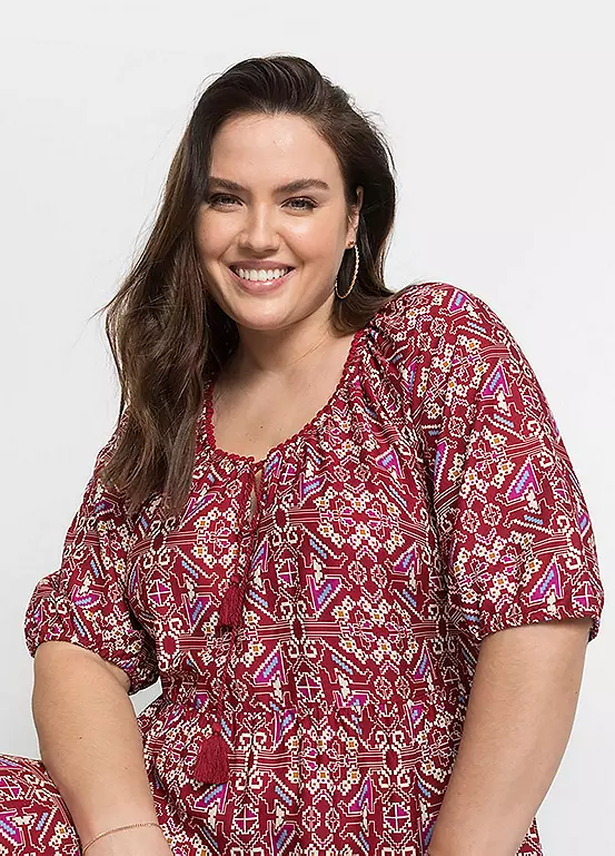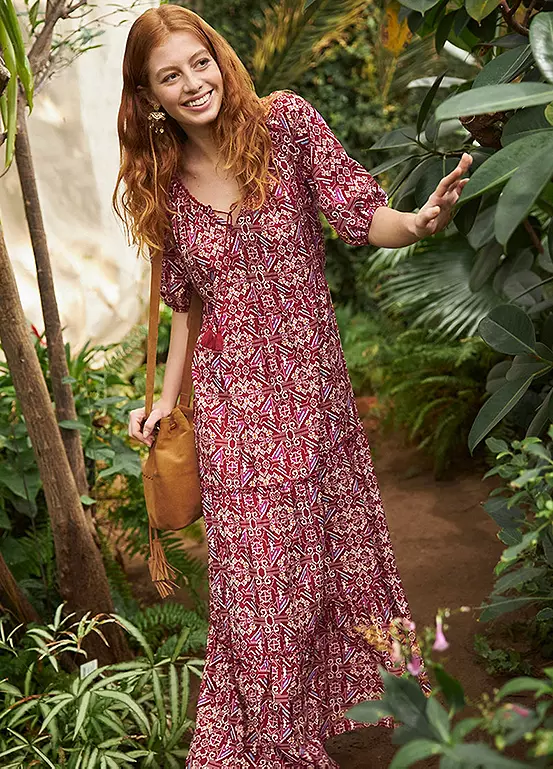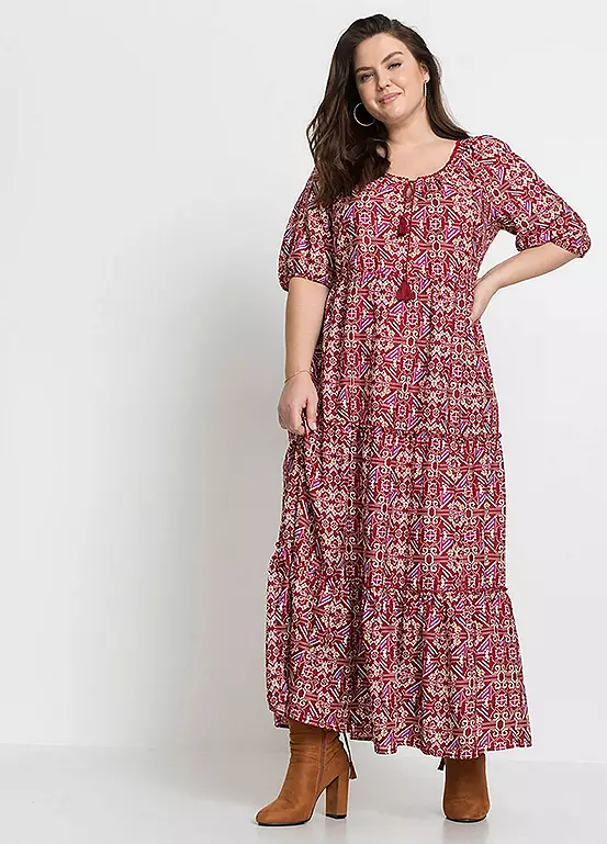Tiered dress with ties at the collar. Length approx. 140 cm (55 in).
