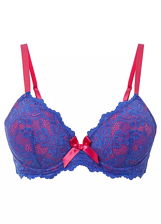 Underwired bra with floral lace covered, padded cups. Made from recycled polyamide. Hand wash.