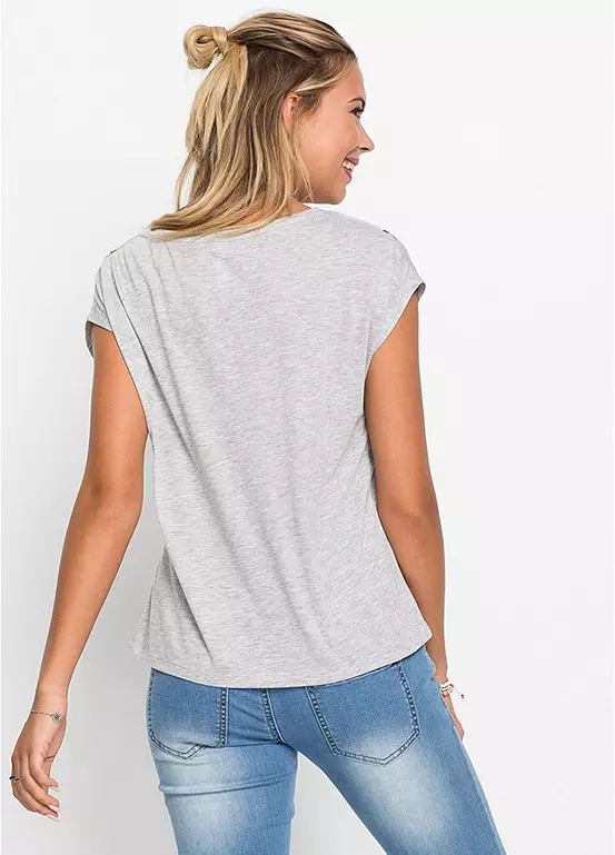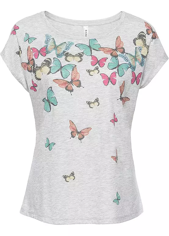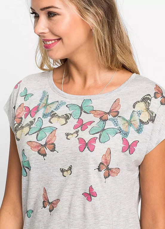 A soft jersey tee with butterflies across the collar and tumbling down the front. Machine washable. 65% Polyester, 35% Viscose. Length approx. 60 cm.