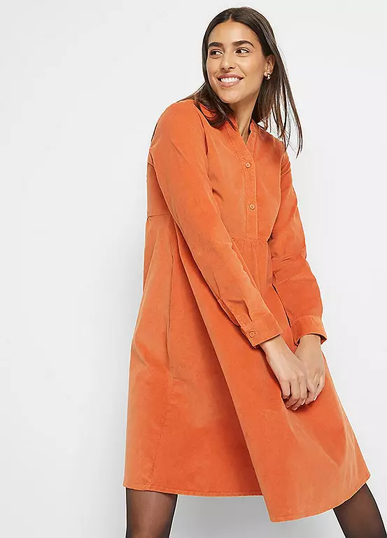 V-neck cord dress with buttons down the front. Machine wash. Length approx. 106 cm.