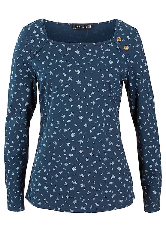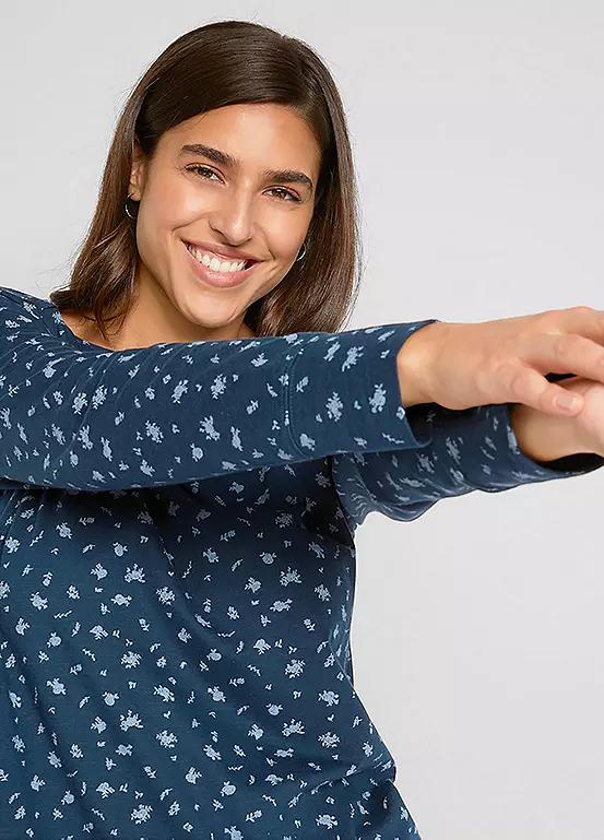 A printed long sleeve top with decorative button detail. Machine washable. 100% Cotton. Length approx. 66 cm.
