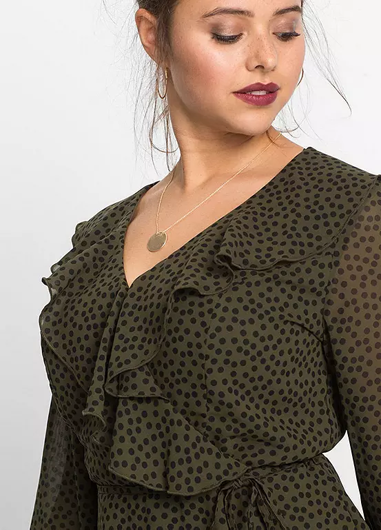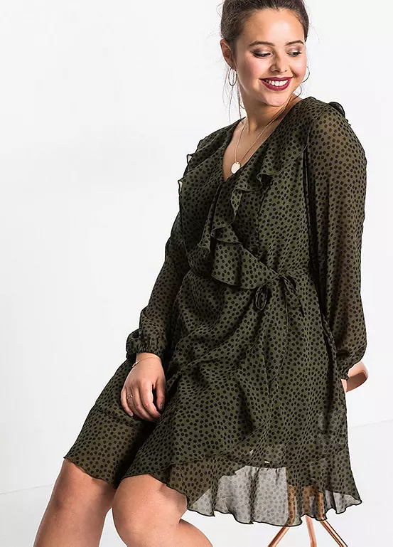 A dotted wrap-look chiffon dress with flounces. Machine washable. Length approx. 90 cm.