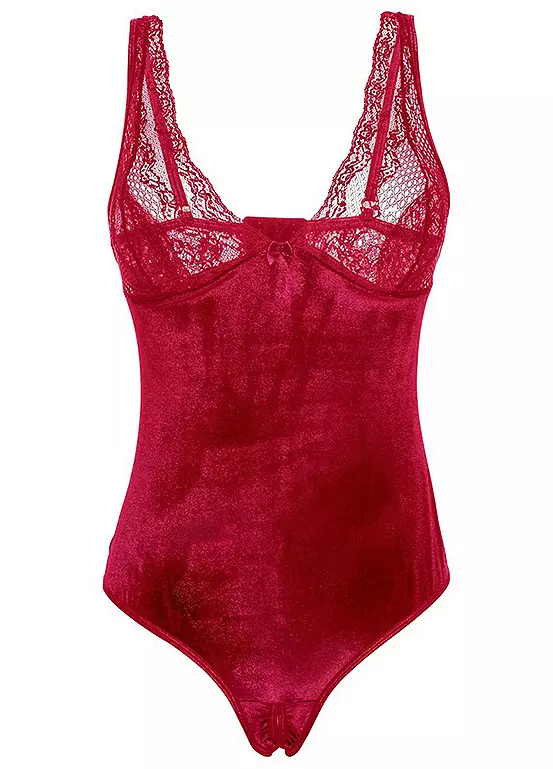 Cute crotchless velveteen body with sheer cups.