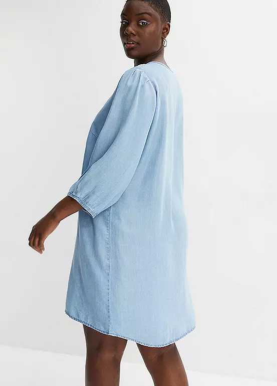 Straight cut denim dress with three-quarter length sleeves. Length approx. 94 cm.