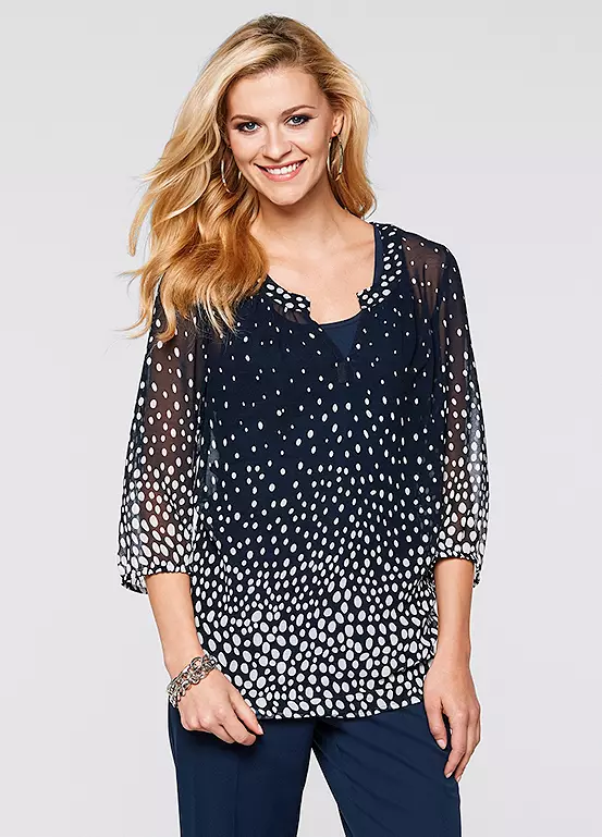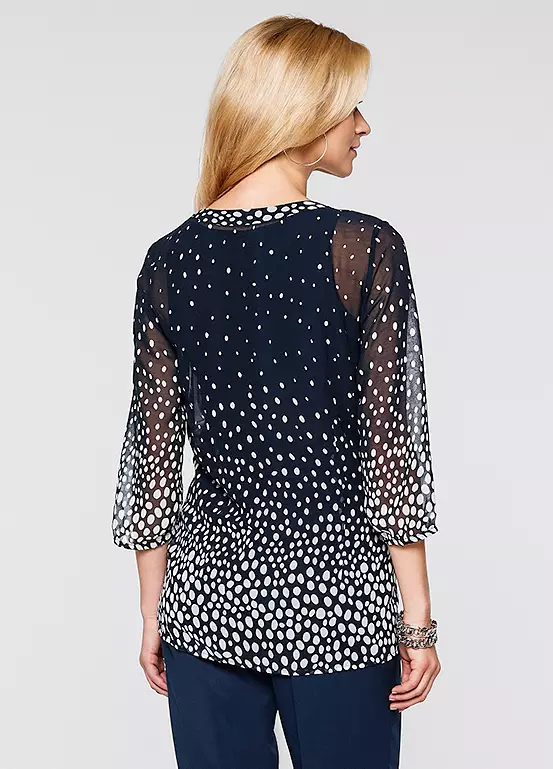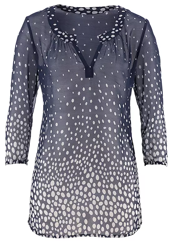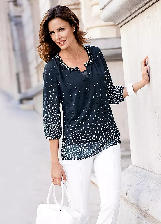 This elegant cropped sleeve blouse has a scattering of dots and hook fastening at the neckline. The material is semi-sheer so wear over a cami or vest. Machine washable. Length approx. 68 cm.
