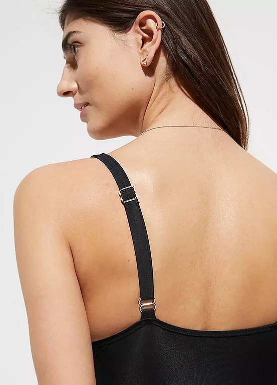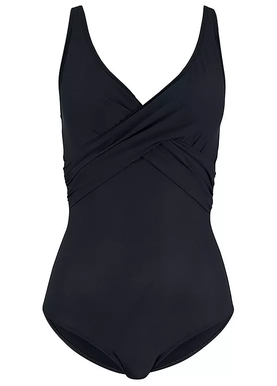 A flattering swimsuit that has a wrap look neckline, and is made from a figure-shaping material with adjustable straps and removable cup padding.