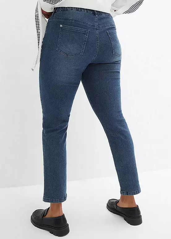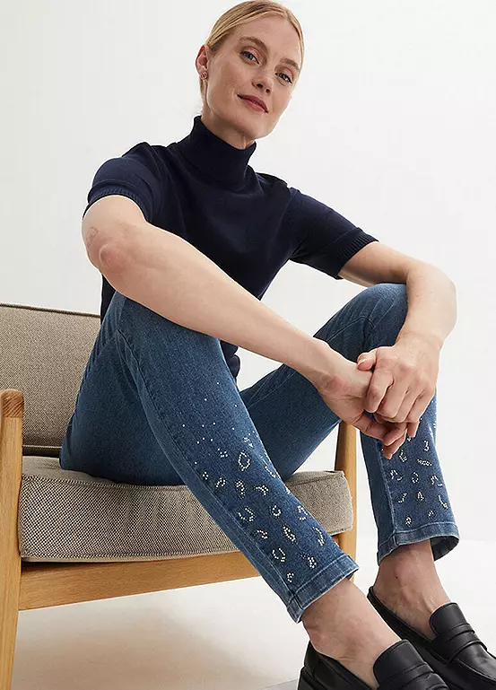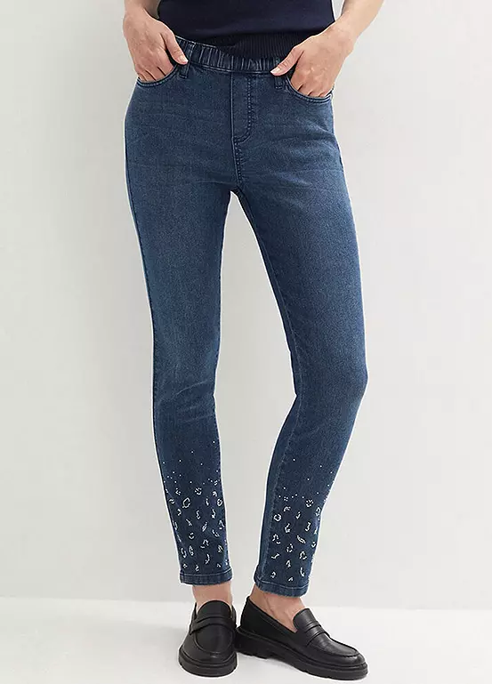 Straight leg denim jeans with an elasticated waist and sparkly print hems. Short inside leg approx. 71.5 cm, Regular inside leg approx. 77.5 cm