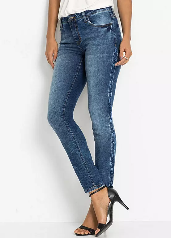 A stretchy pair of denim jeans with embroidered piping down the side seams. Machine washable. 81% Cotton, 17% Polyester, 2% Elastane.