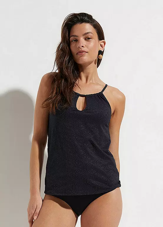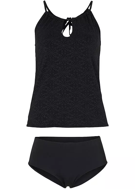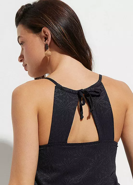 Long tankini top with a cut-out back and matching bottoms. Outer Material: 94% Polyamide, 6% Elastane. Bottoms: 80% Recycled Polyamide, 20% Elastane. Lining: 100% Polyester.