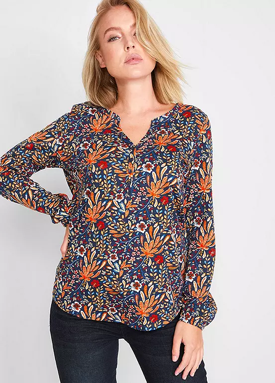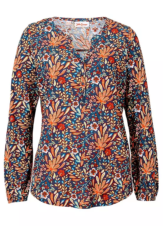 A long sleeve tunic with an arts and crafts inspired floral print. Machine washable. 100% Cotton. Length approx. 70 cm.
