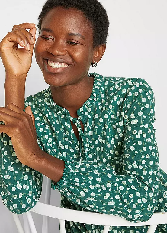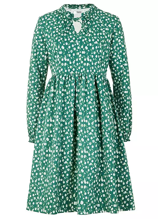 Floral print dress with ties at the collar. Length approx. 132 cm.