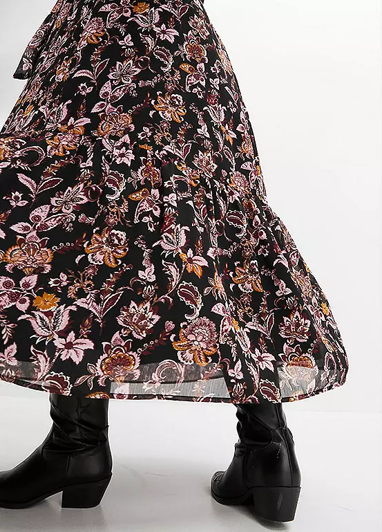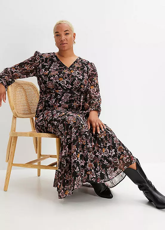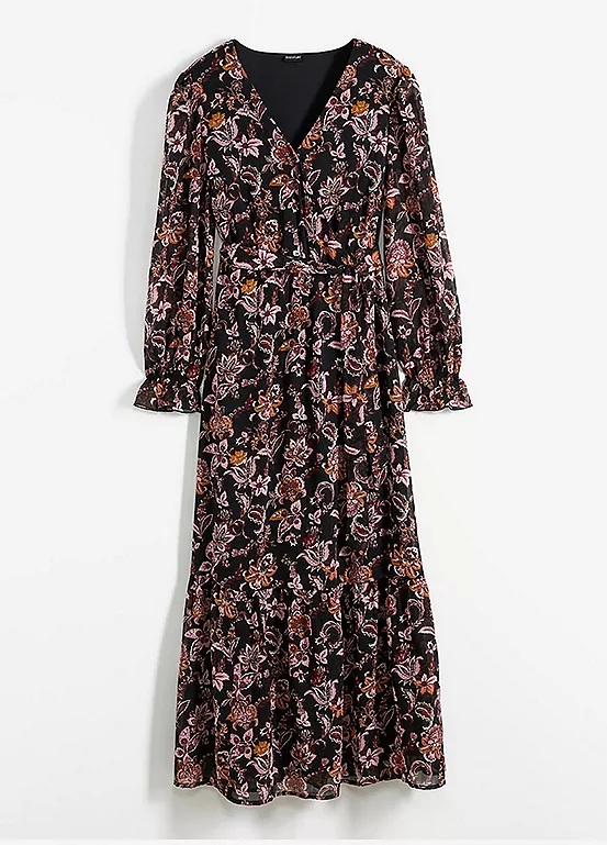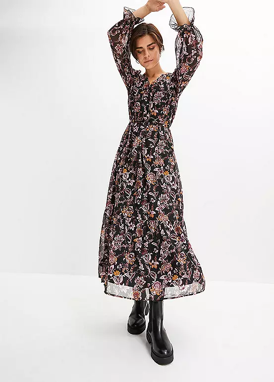 Long dress with a floral pattern and elasticated cuffs. Machine wash. Length approx. 136 cm.