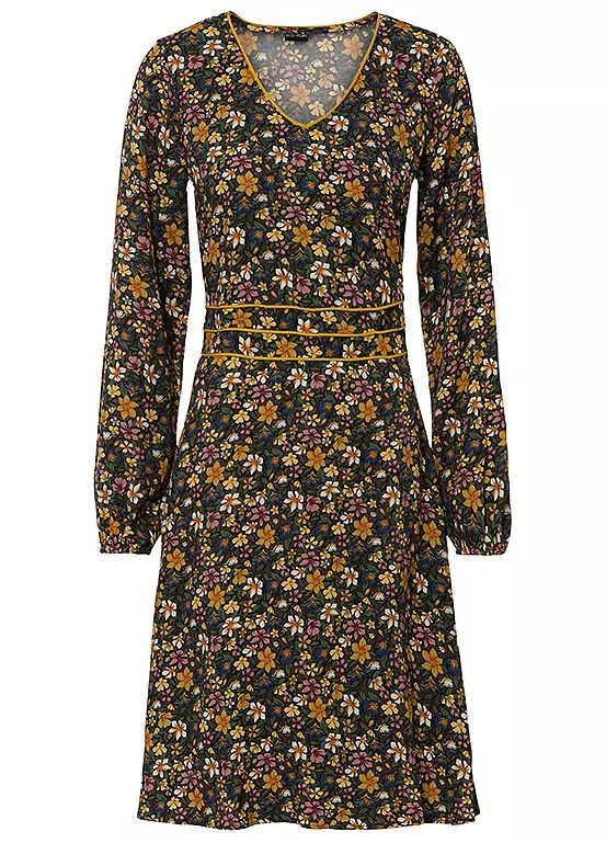 A puff sleeve dress with a floral pattern. Machine washable. Length approx. 104 cm.