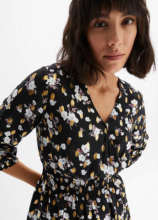 Floral print wrap blouse with a smock insert and three-quarter sleeves. Machine washable. 100% Viscose. Length approx. 66 cm.