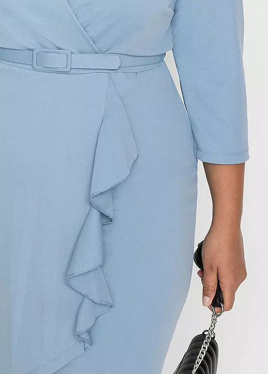 Plunging wrap dress with flouncing and waist ties. Length approx. 94 cm.
