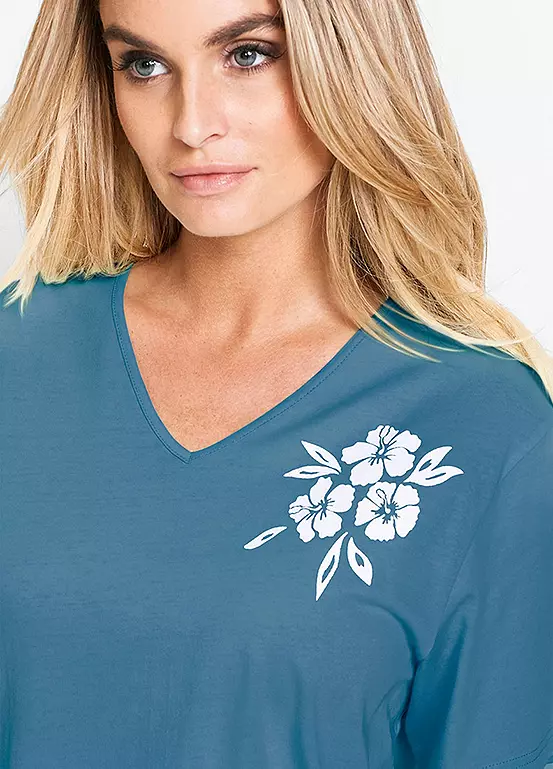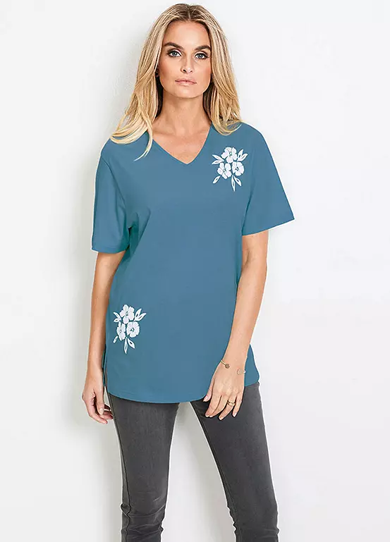 A single jersey flower print top with a v-neck. Machine washable. Length from approx. 72 to 80 cm.