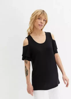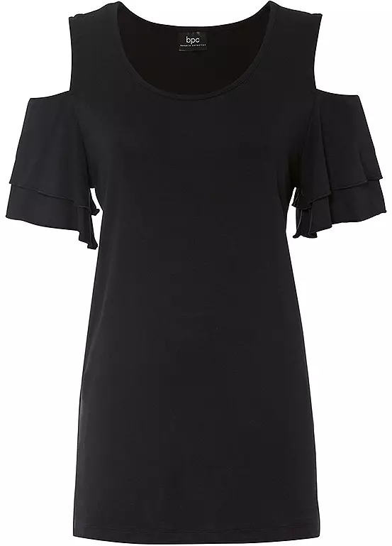 Fluted sleeve top with cut-out shoulders. Machine washable. 95% Sustainable Viscose, 5% Elastane. Length approx. 74 cm.