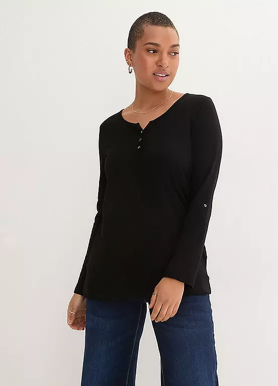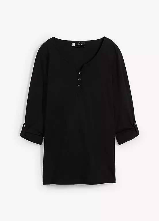 A soft cotton jersey tunic with a short button panel at the collar and turn-up sleeves that can be secured with a bar.