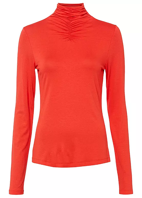Sustainable viscose top with a ruched collar. Machine washable. 95% Sustainable Viscose, 5% Elastane. Length approx. 64 cm.