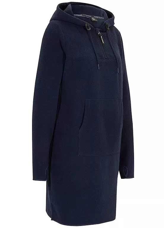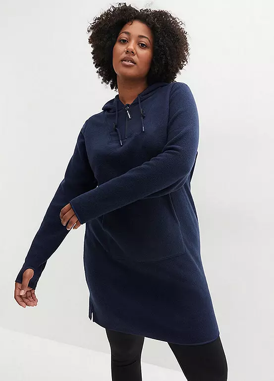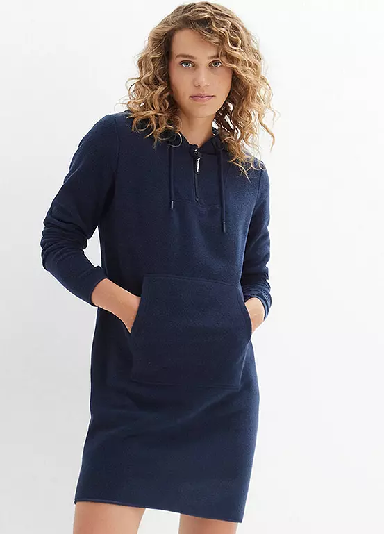 Sporty fleece sweater dress with a hood and a pouch pocket. Length approx. 96 cm.