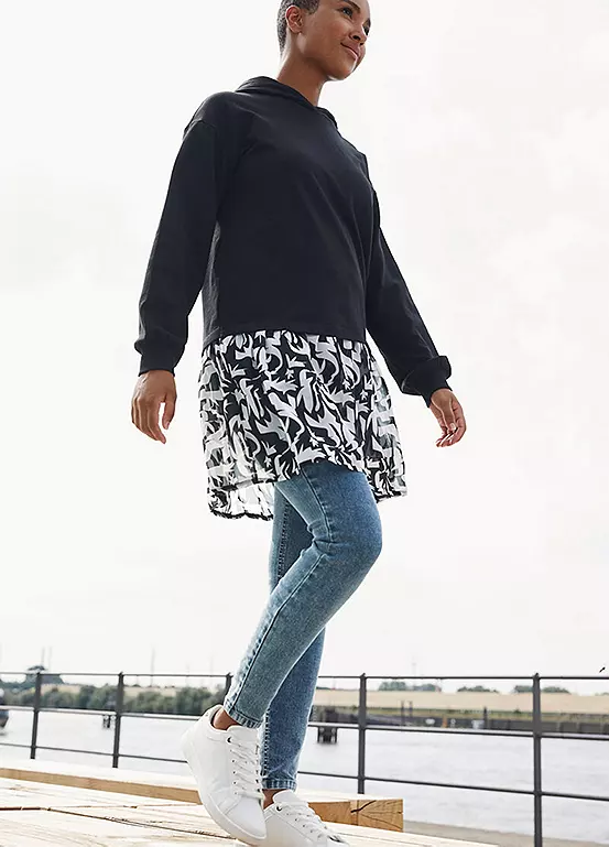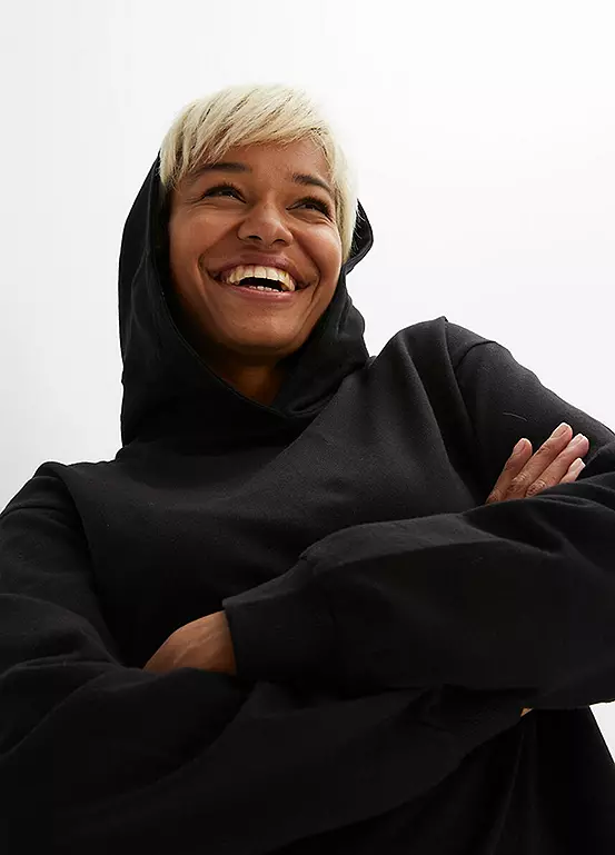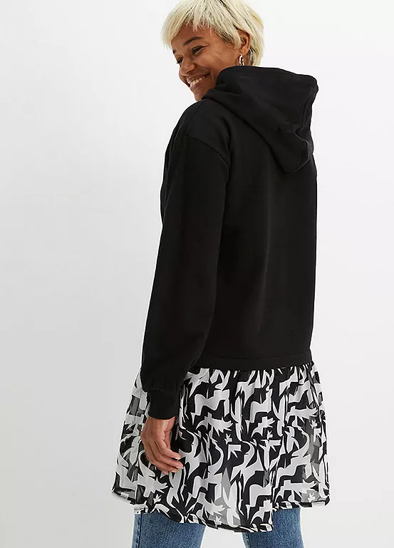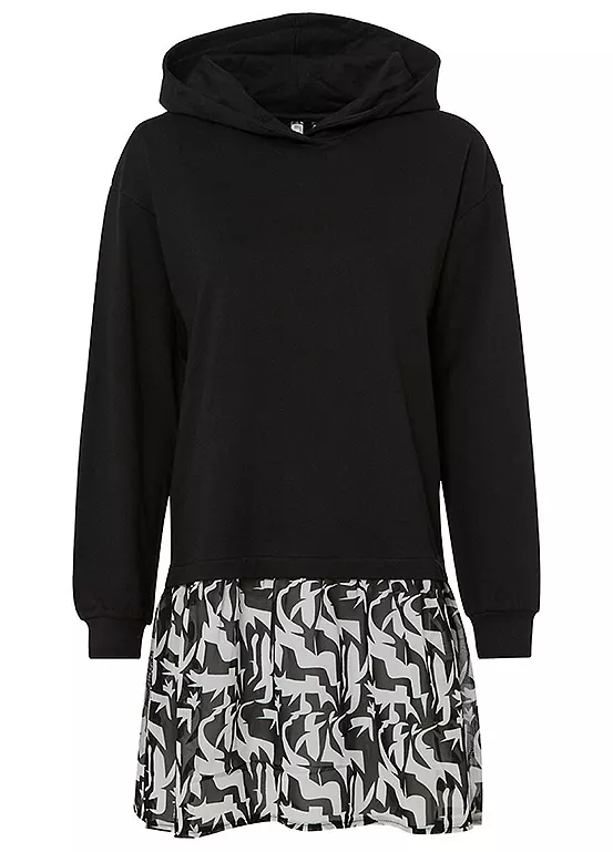 Hooded sweater dress with a contrasting skirt. Length approx. 90 cm.