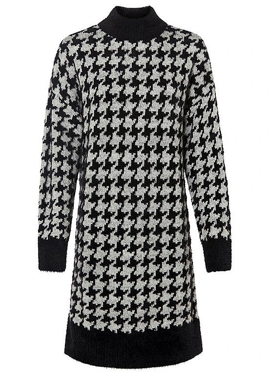 Knitted dress with houndstooth checks. Machine washable. 74% Polyamide, 17% Viscose, 9% Polyester. Length approx. 90 cm.