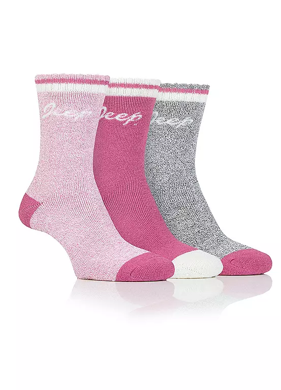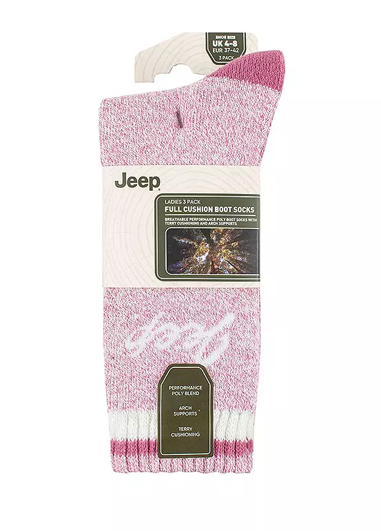 Ladies 3 Pr jeep performance poly boot socks. Rose/Cerise/Cream Performance poly socks. Terry cushion for added comfort. Soft touch yarn. 3 marl socks. Size approx. 4 to 8.
