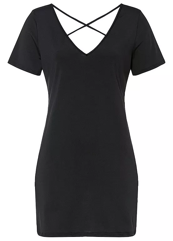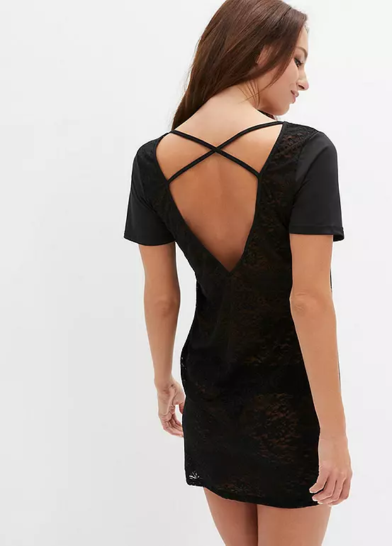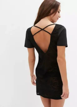 A short negligee with a lace back and cross straps.