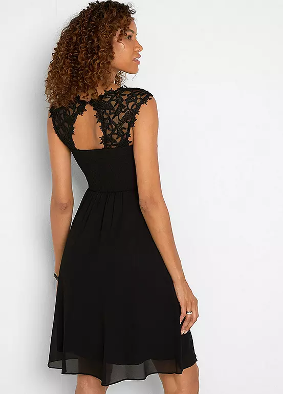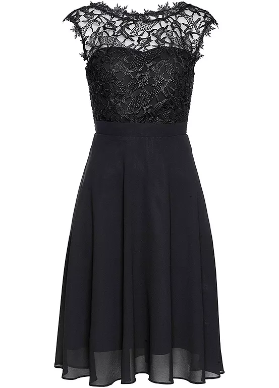 Elegant skater dress with a beautiful lace bodice. Machine washable. Outer Material: 100% Polyester. Lace: 100% Polyester. Lining: 100% Polyester. Length approx. 104 cm.