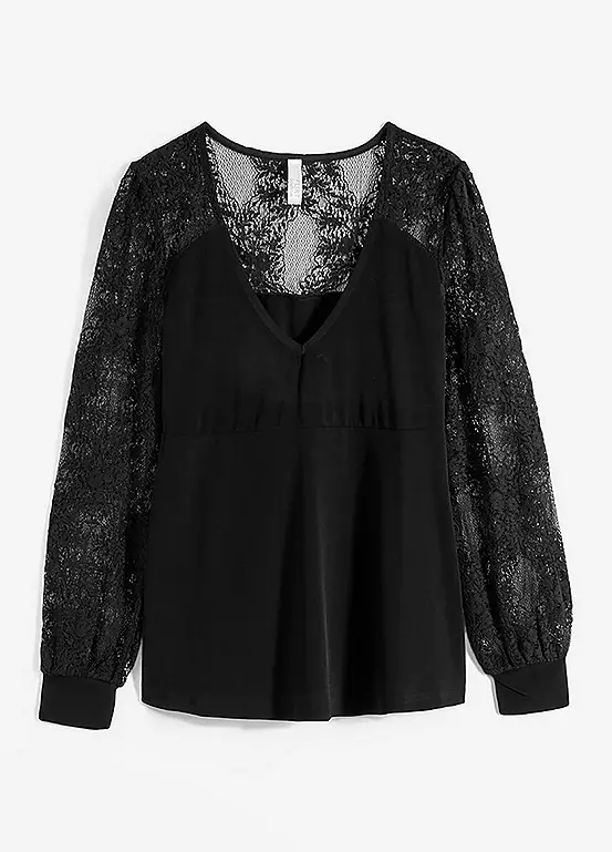 Jersey tunic with a V-neck collar and sheer sleeves. Length approx. 64 cm.