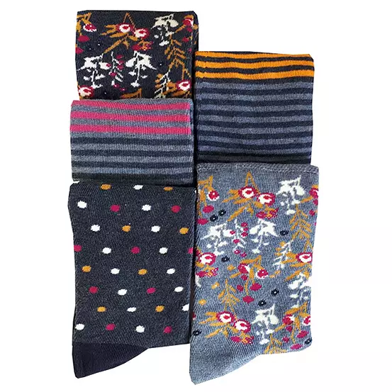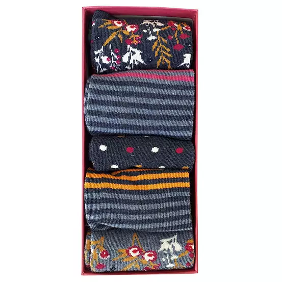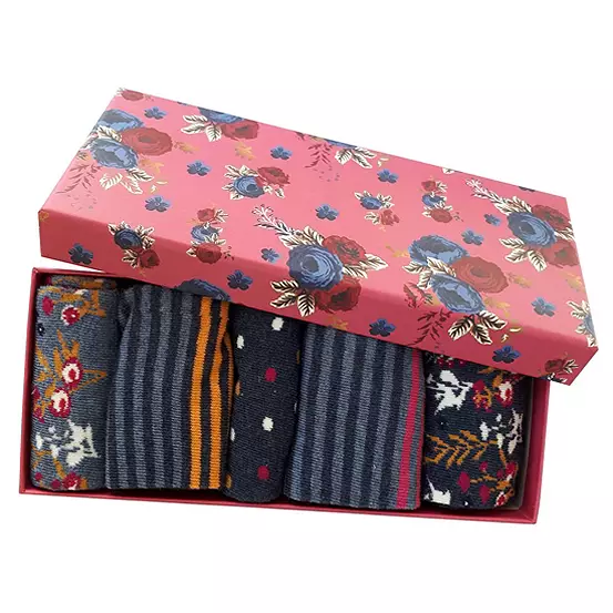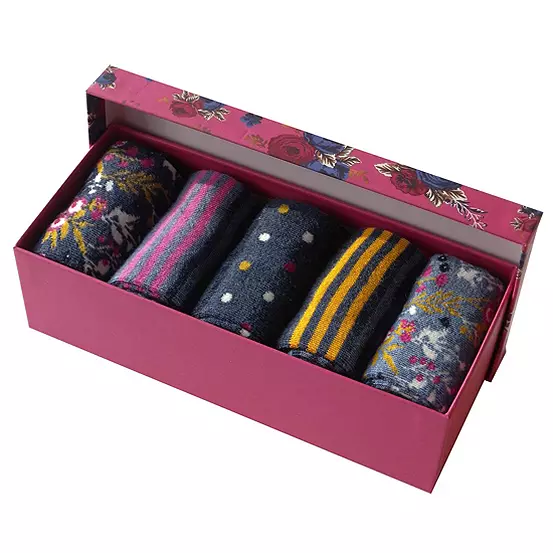 This gift box of socks makes a lovely gift. It includes 5 pairs of patterned socks presented in a pink floral gift box.