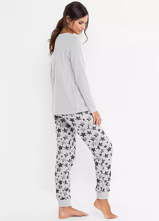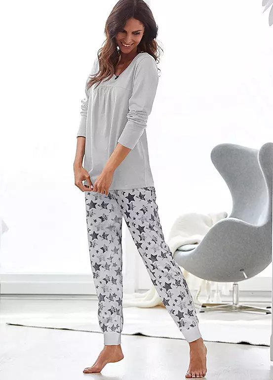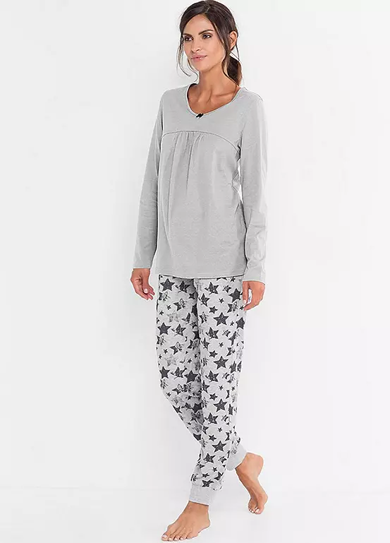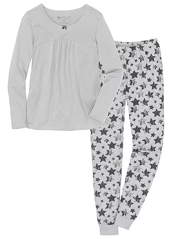 A long sleeve PJ top with ruching at the chest seam and matching bottoms. Machine washable. 100% Cotton, Bottoms: 95% Cotton, 5% Viscose.