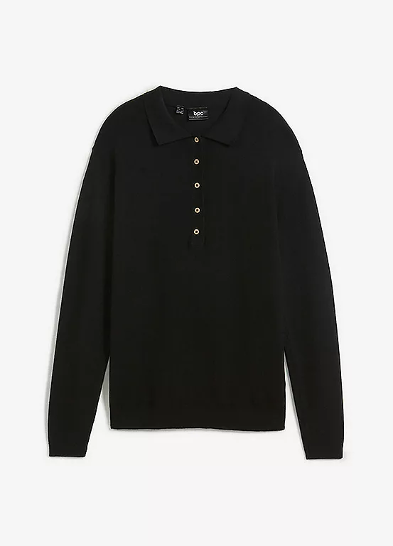 Smooth knit polo with buttons beneath the collar. Machine wash. Length approx. 66 cm.
