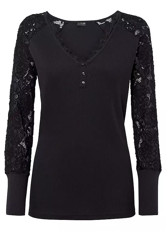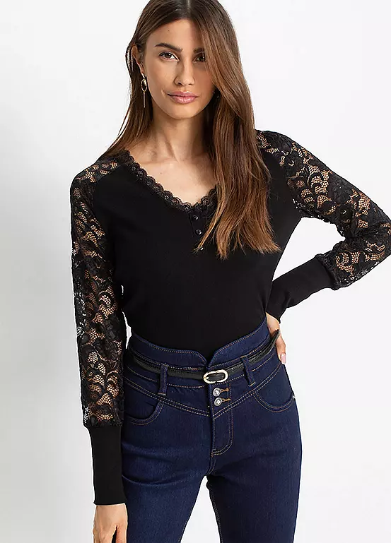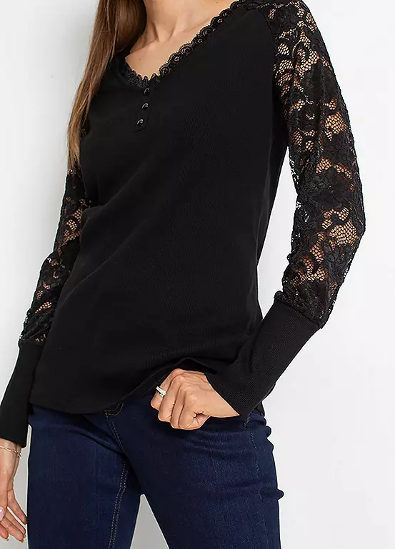A jersey top with sheer lace sleeves. Machine washable. 100% Cotton, Lace: 100% Polyester. Length approx. 68 cm.