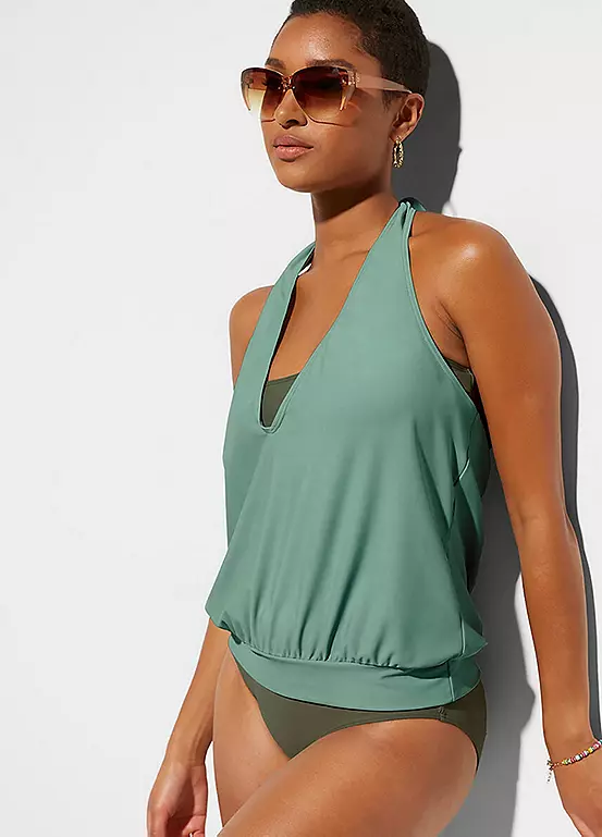 A loose fitting tankini top with a v-neck collar and halter tie straps. The cup padding can be removed and there are matching bottoms included. Hand wash. 80% Polyamide, 20% Elastane, Lining: 100% Polyester.