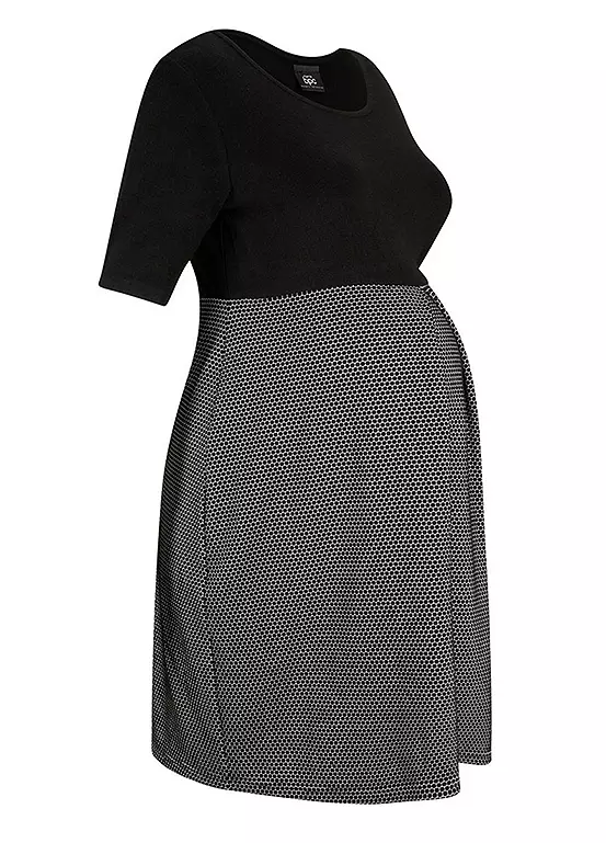 A short sleeve dress with a printed skirt that has a pleat to allow ample room for your changing shape. Machine washable. Shell: 96% Acrylic, 4% Elastane, Loose Shell: 100% Polyester. Length approx. 92 cm.