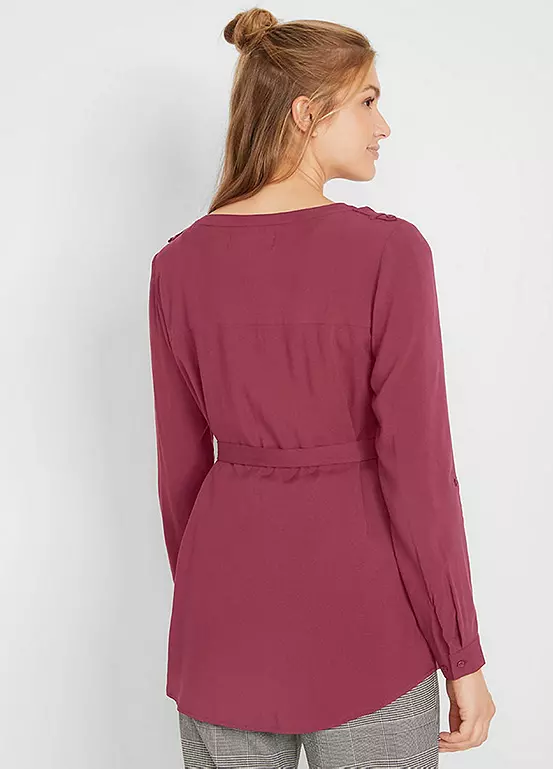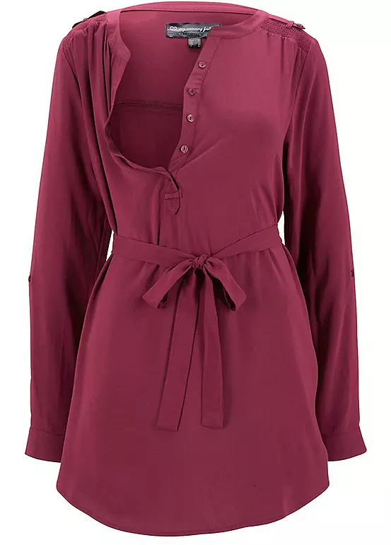 A long sleeve blouse with ties at the waist and a short button panel to allow easy nursing once your little one arrives. Machine washable. 100% Viscose. Length approx. 74 cm.
