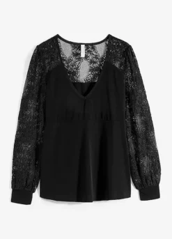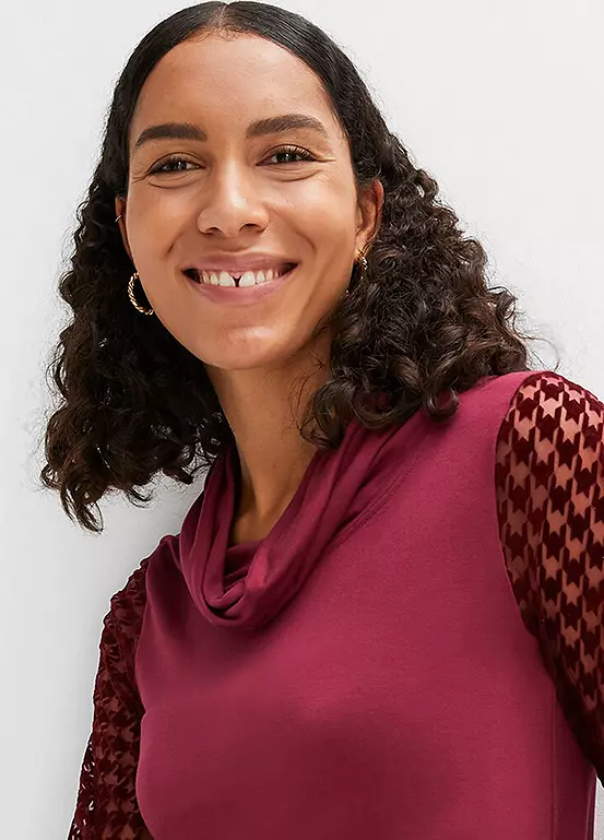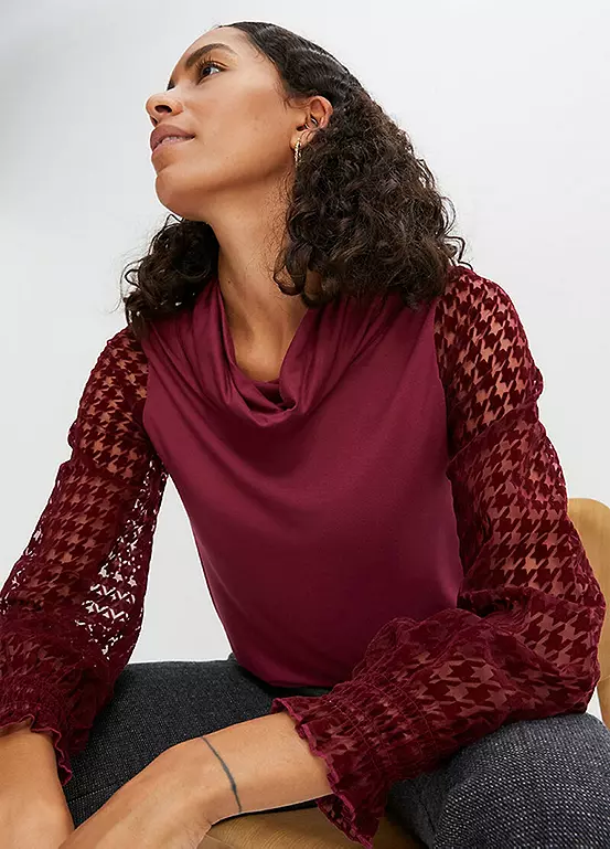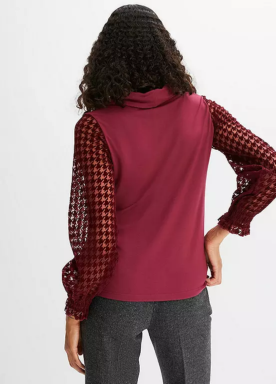 Turtleneck top with net sleeves that feature a pattern. Length approx. 64 cm.