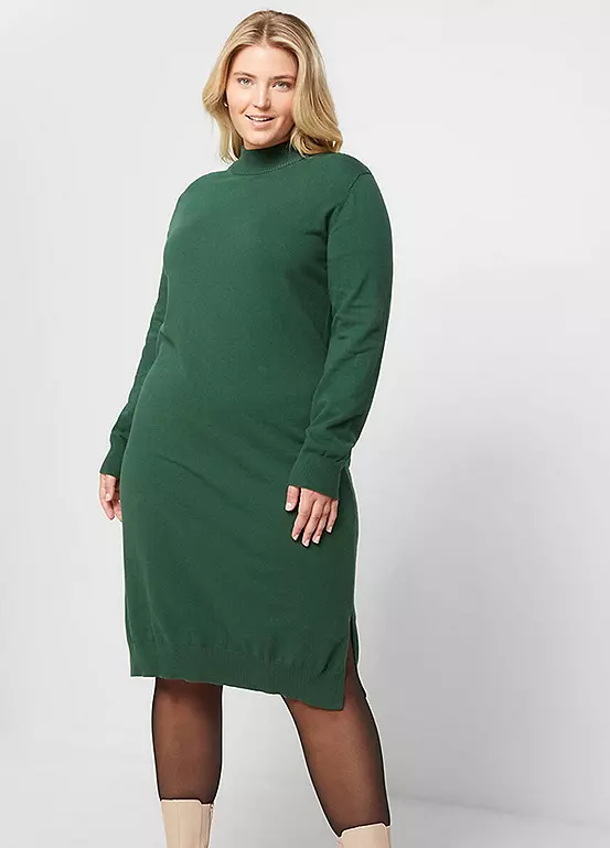 A smooth knit dress with a turtleneck collar. Machine washable. Length approx. 108 cm.
