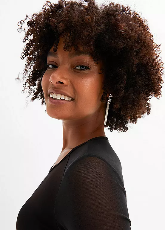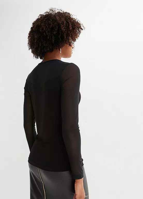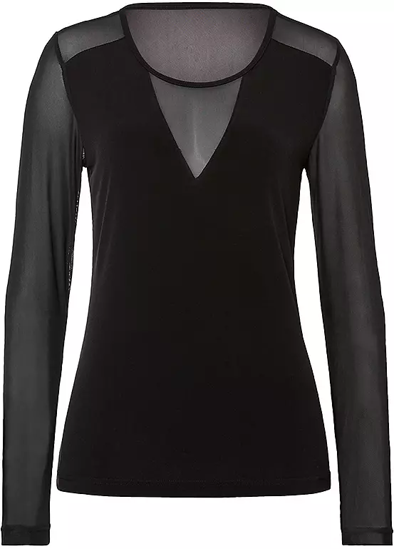 Fitted jersey top with sheer net at the V-neck collar and upper back. Length approx. 64 cm.
