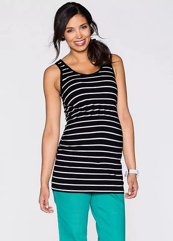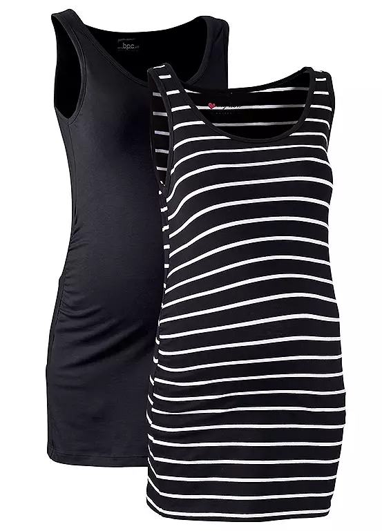 Two longline tank tops in stretchy jersey to see you through pregnancy and beyond. Side ruching allows plenty of room for your expanding bump. One plain and one with horizontal stripes. Machine washable. 95% Cotton, 5% Elastane. Length approx. 74 cm.