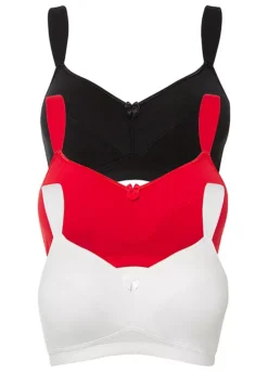 Non-wired. Three soft bras in organic cotton. 1 x Black, 1 x White and 1 x Red. Machine washable.